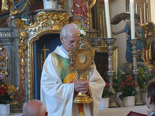 Einer alten Tradition gemäß begeht die Pfarrgemeinde das Kirchweihfest der Pfarrkirche St. Florian in Stein am 3. Sonntag im Juli. Gemeinsam mit Abordnungen von ÖKB und KAB sowie einem Bläserensemble wurde zunächst Gottesdienst gefeiert, an dessen Ende der eucharistische Segen für den Ort und seine Bewohner stand. – Ein „Überbleibsel“ von der früheren Prozession durch den Ort, die aufgrund des beschwerlichen Weges und der doch schon in den meisten Fällen betagteren Gottesdienstbesucher nicht mehr stattfinden kann.
